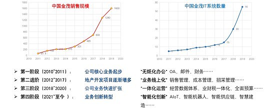 中国金茂的数字化建设整体起步较早,于2010年开始全面推进信息化建设;2018年,开始在公司不同层级和不同维度开展数字化建设,短短三年内就完成了一体化运营体系的规划和建设工作,现在逐步拓展智能化的新业务。总体上看,数字化建设需要同步业务发展进行,不再是简单的业务线上化,而是在信息化的基础上,让数智技术与业务深度融合。