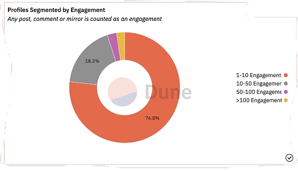 当前Lens官方已通过签署公开信和与项目方合作活动向社区发放出93900个Profiles,持有地址86422个,唯一持有率高达92%,上架率仅3%。根据Dune用户niftytable制作的Lens数据面板,Lens生态里用户与协议交互次数1-10次的占比为76.8%,10-50次交互的用户占比18.2%,50次以上占比5%。近半年月度活跃用户数为1-2万。