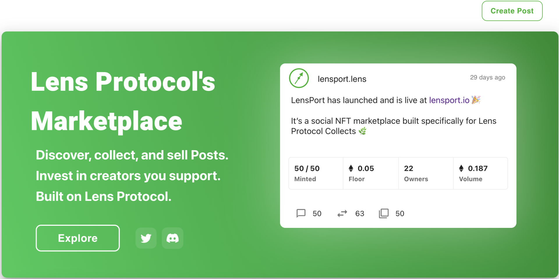 LensPort是针对Lens协议上内容和Profile交易的NFT市场,于2022年10月份推出,官方推特关注数4.4K。LensPort 将社交平台和NFT市场相结合,用户可以在上面发布、发现、出售帖子,可以购买帖子,也可以发现被Collect的热门帖子和Profile,还可以交易Profile。但当前使用人数较少,Lens Profile成交额不足1 ETH。