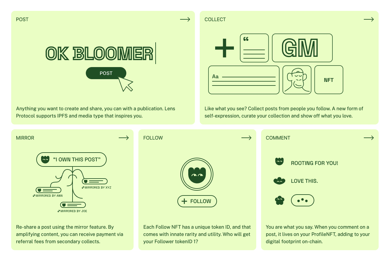 Profile NFT是Lens协议中的主要对象,拥有该NFT的所有权意味着你可以控制自己的内容。单个钱包地址可以拥有一个或多个Profile NFT。profiles所有者创建和设置个人profiles,基于profiles用户可以关注(支持付费和免费),发帖,转发/镜像(支持内容分销),评论、Collect(支持限时、限量付费或免费的方式)、治理、多重签名。