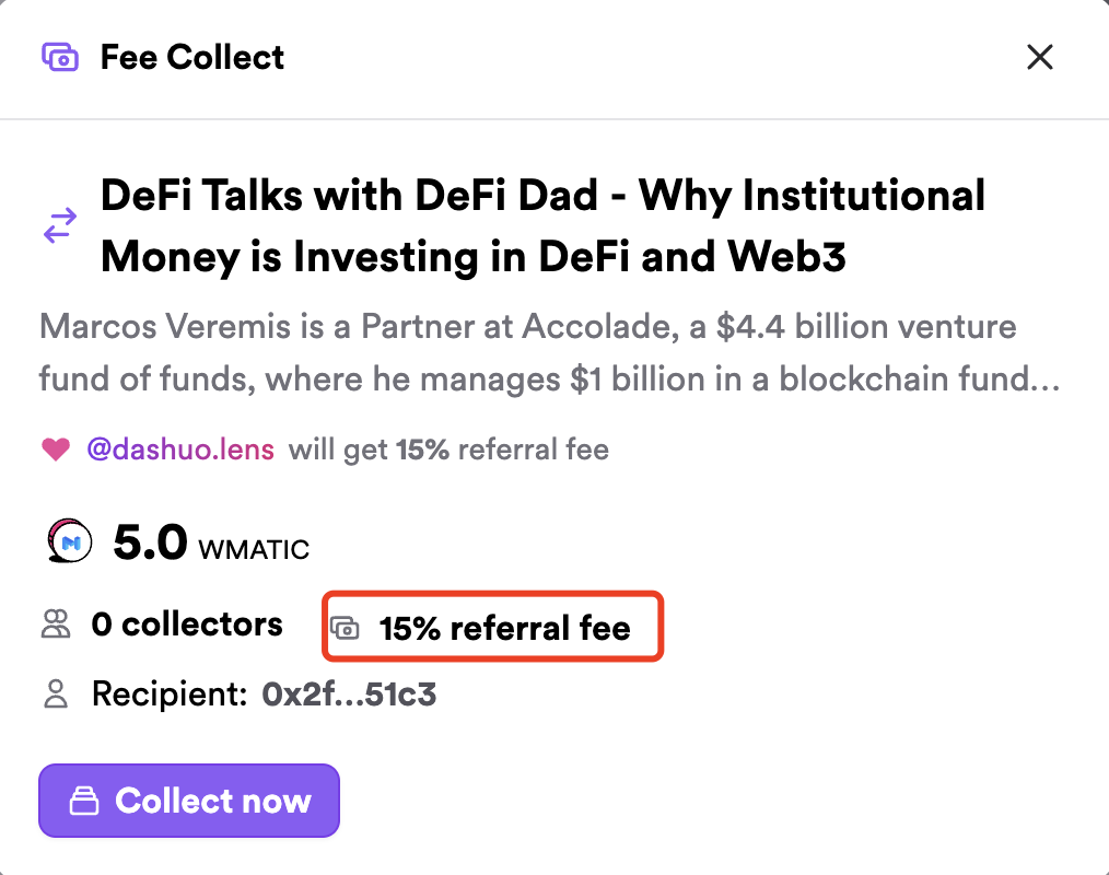 在Lenster上发布帖子可以选择可访问对象(关注的人、被关注的人、朋友的朋友以及所有人),也可以根据需要开放是否可被其他用户收藏的选项,还可以对帖子收藏者设置收藏费用。Lenster也上线了内容分销,如果有用户通过你的转发去付费收藏某条帖子,你也将获得分成。目前默认值为15%。