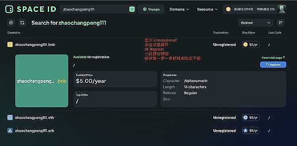 连接好钱包后在搜索框输入要购买的域名前缀并点绿色放大镜搜索