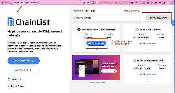 按下图步骤连接钱包并把 BNB Chain 添加到小狐狸钱包