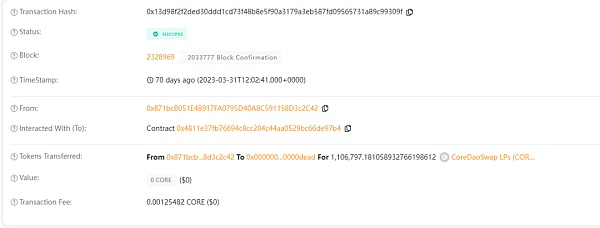 CoreDAOSwap通过将LP转入黑洞地址、回购销毁等措施确保了CDAO流动性深度,维护了项目市值的稳定。也让用户和持有者看到团队对于项目的信心,以及在项目运营中一切公开透明没有黑箱操作,有效地保护了投资者的权益,是一个值得信赖的团队。