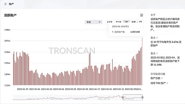 区块链浏览器TRONSCAN数据显示,6月12日,波场TRON活跃账户数达到4,207,440,创下2023年以来新高。过去30天, 波场TRON平均日活跃账户数达267万。