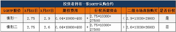 如果在合约到期日,50ETF市场价是2.9元/份,王先生选择行使权力,就能够以2.75元/份价格买入10000份50ETF,花费27500元,而此时按照市场价买入,则需要花费29000元。