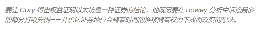 此外,Cochran认为这些文件对Gensler的立场不利,因为它们承认了资产“反向变形”成为证券的概念。假设SEC想要证明以太坊在当今是一种证券,那么他们必须承认“变形”的概念,并证明发起人对资产的所有二次销售负有责任,并打破所有横向和纵向共性的先例。