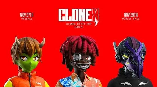 RTFKT诞生于2020年NFT市场爆发前夜,早期的业务定位是设计和制作虚拟鞋、虚拟服饰等NFT商品,后因设计出各种时尚虚拟运动鞋而被外界注意。2021年底,它的虚拟服饰打造业务因为被耐克收购而再次出圈,趁热打铁,RTFKT同年推出了CloneX这个3D人物NFT系列。