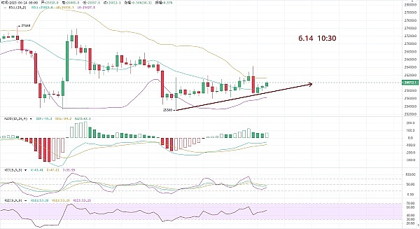 昨天的大饼以太一直是震荡上行的趋势,晚间小幅拉升后插针回落,最低点在25700附近,距离我们昨天给出的空单仅100点距离,只要不跌破下方支撑位,大概率还是会震荡上行的,而以太目前表现十分弱势,处于一个窄幅震荡走势,不建议短期布局以太。15号凌晨,美联储利率决议和鲍威尔讲话也将来袭,鲍威尔的言论和对降级的预期十分重要,到时我们再重点关注。