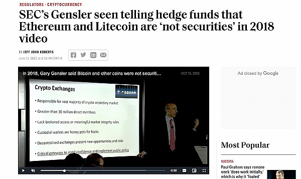 如今,SEC与CEX的战火硝烟已经蔓延到整个加密行业,甚至有人爆出Gary Gensler曾经对于加密货币截然不同的看法。6 月 13 日,据《财富》杂志报道,美国证券交易委员会(SEC)主席 Gary Gensler 曾于 2018 年出席彭博社和富达举办的以加密货币为主题的机构投资者活动时表示,「Bitcoin(BTC)、Ethereum(ETH)、Litecoin(LTC)、Bitcoin Cash(BCH)不是证券。」
