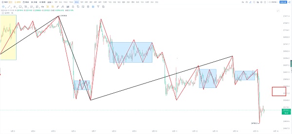 趋势多空分界25343已经破位,走势升级为更大级别的下跌调整。反弹还是15f和30f三卖机会,大概位置25400~25600附近。