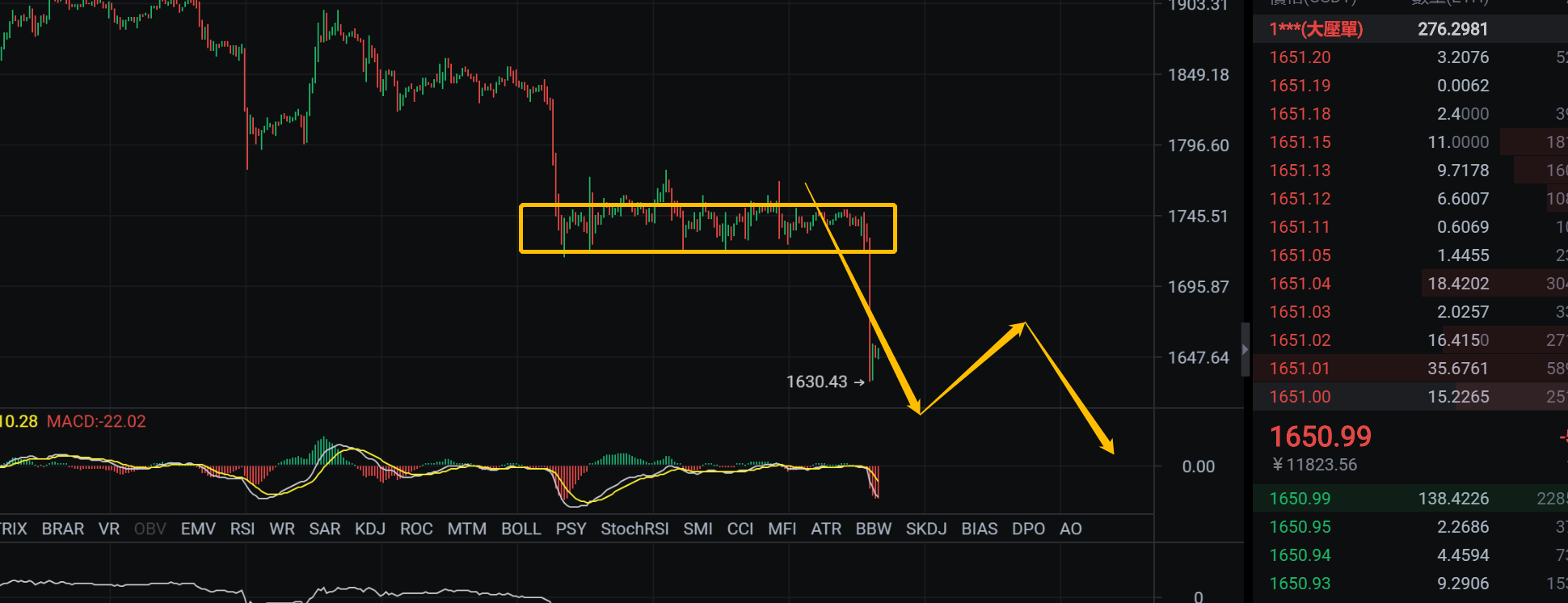 姨太1H的结构,姨太的走势跟大饼一样,目前都是下降趋势之中,都是还是非常的弱的。需要注意规避风险,走的比大饼还要弱上许多。整体还是需要多注意为主。昨天的1650今天就到了。整体姨太还是太弱了。操作上的话规避姨太为主,还是大饼为主基调。