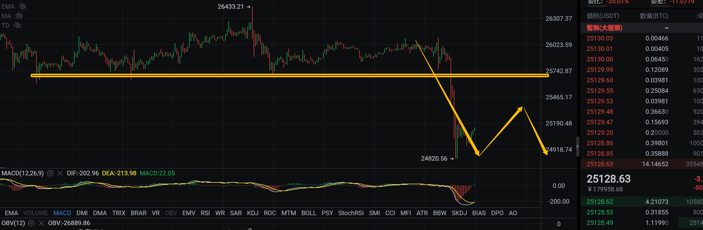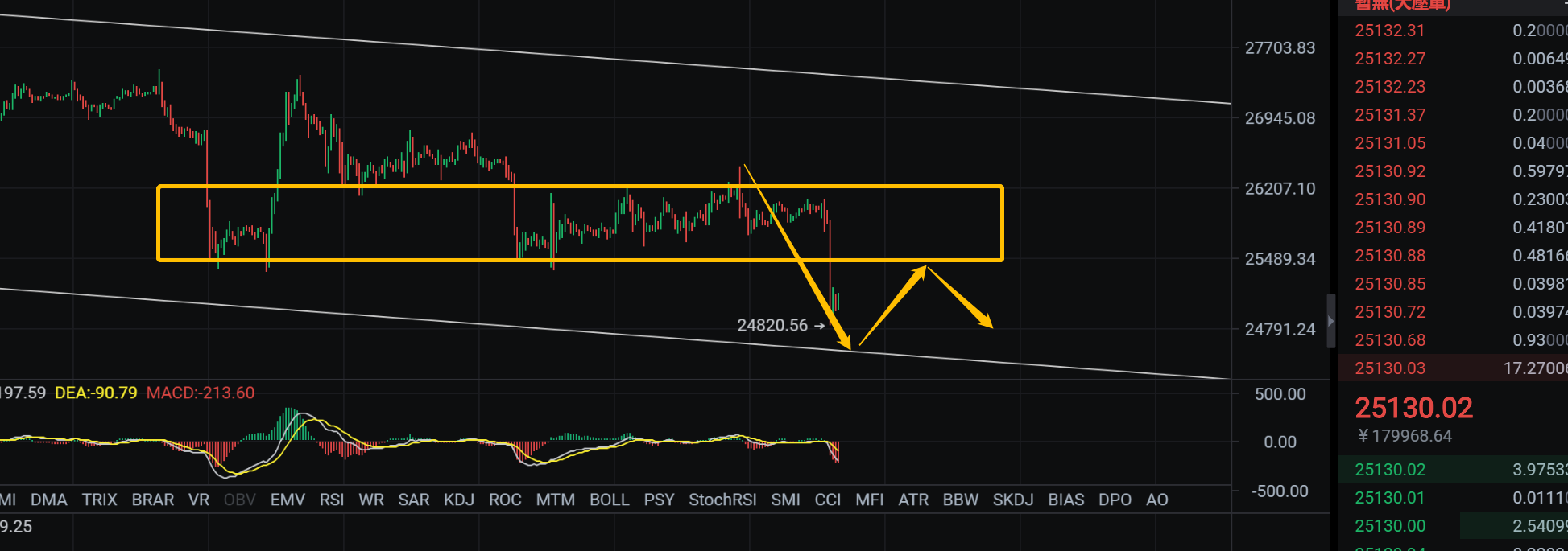 大饼15F的结构,目前大饼还是第一笔15F的下跌,下跌的力度还是非常大的。短期的话这笔15F的下跌还未结束,估计还得往下蹭一蹭,不过短期不一定会跌破前低的位置,然后就容易走一笔15F的反弹,短期还是看25600是否能够突破,不能够突破的话就是一个三卖的风险,还是需要谨慎注意的。