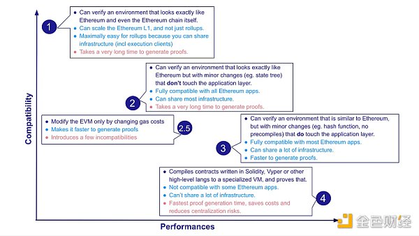 因此,各类 zkEVM 旨在为以太坊工具提供不同程度的支持,但 zkEVM 与以太坊兼容性越高,性能也就越低。(有关更多 zkEVM 类型的信息,请参阅文章结尾处)