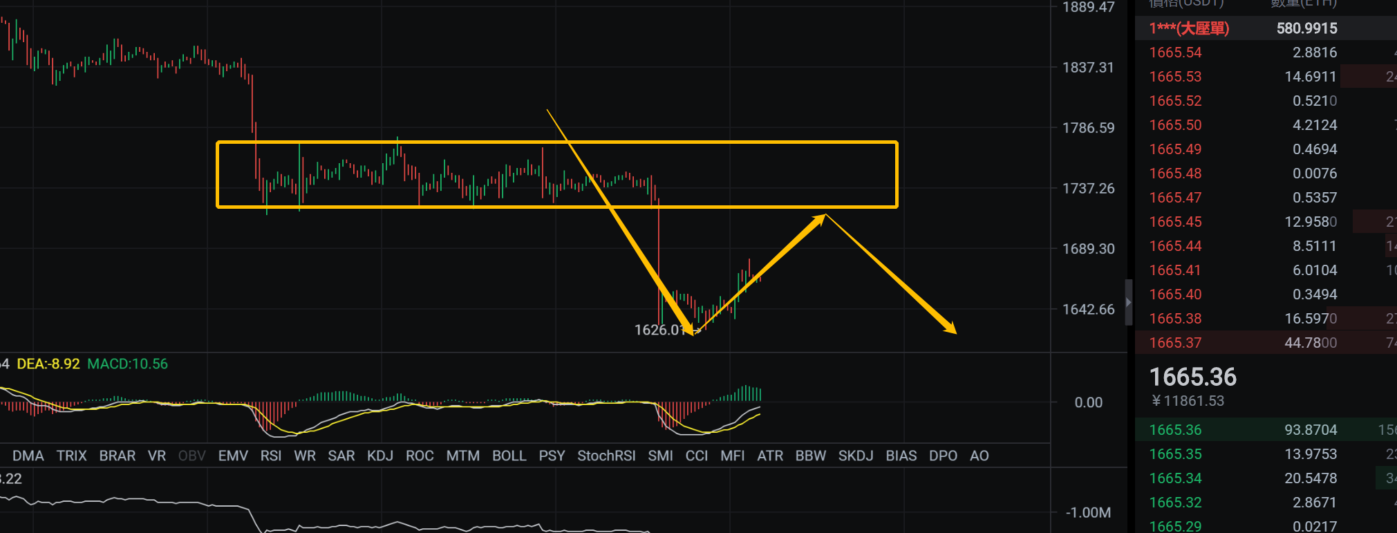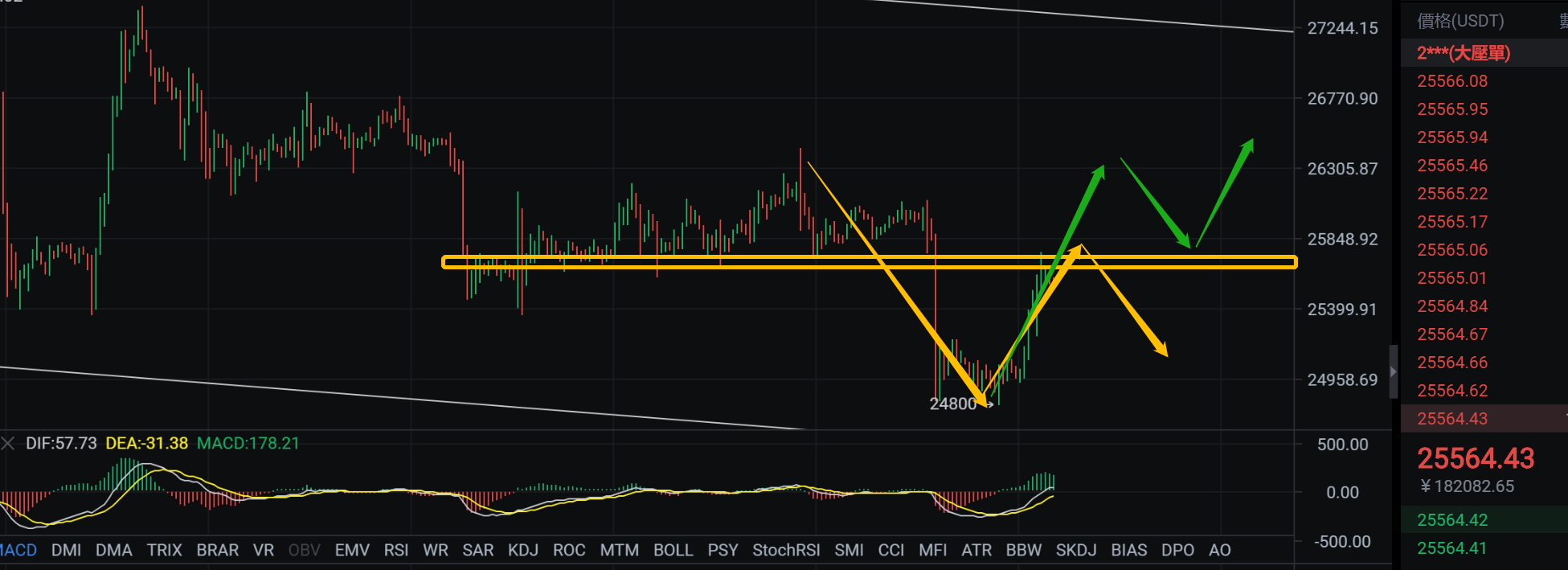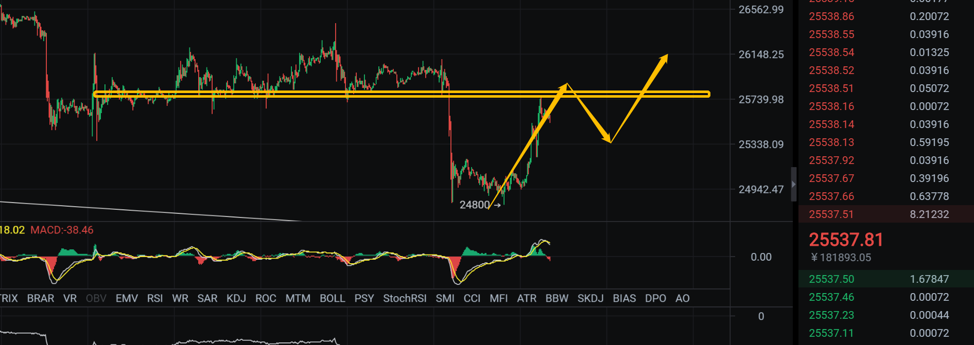 大饼1H的结构,目前大饼已经走到我预期的25600附近。看这个位置是否能够突破了。如果不能够有效突破站稳的话那么就是三卖的风险,后续还会有一笔1H的下跌是要走的。也就是如图黄色笔所示。如果能够突破25600并且能够去26000的话那么整体的走势就比较好了。后续回调估计也不会跌破25600,然后继续在走一笔1H的上升,也就是如图所示的绿色笔走势。所以咱们今天重点的观察就是25600的得失了。