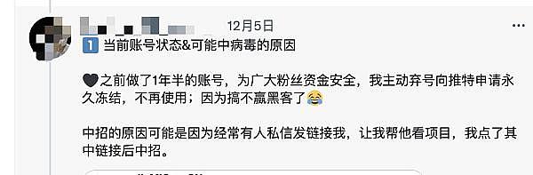 推特KOL点击别人私发链接,导致推特账户被盗,然后发布带毒空投信息,利用粉丝对KOL的信任点击链接盗走粉丝资产。