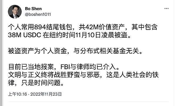 22年11月,分布式资本创始人沈波价值4200万美元的数字资产被盗,被盗资产包括:38,233,180 枚 USDC、1607 枚 ETH、719,760 枚 USDT 以及 4.13 枚 BTC。据安全机构慢雾后续分析称,被盗是因为助记词泄漏所导致。