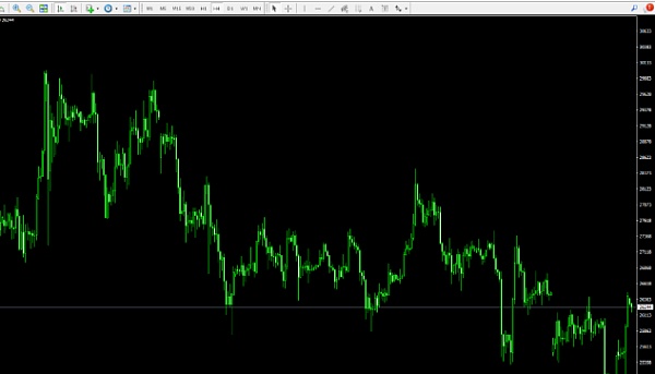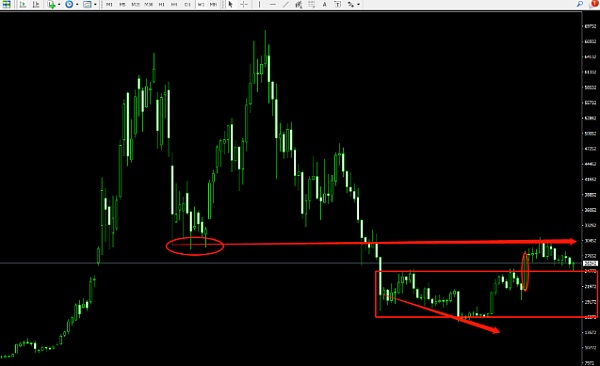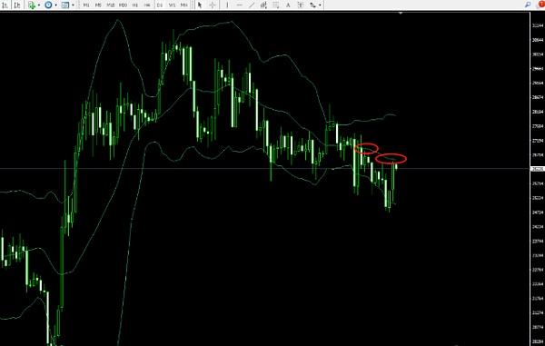 依然看图说话,26500为日线布林带中轨,可以观察到前期很多个交易日,价格均运行在布林带中轨之下。日线锯齿形下跌,价格高点不断下移,弱势运行。目前价格连续2个交易日的近乎光头阳线,冲高26500受到短暂压制!