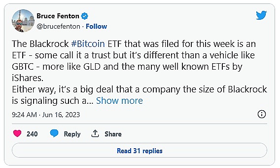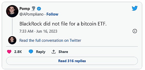 与此同时,著名播客主持人安东尼·庞普利亚诺(Anthony Pompliano)强调了该文件的技术性,并解释说贝莱德实际上已经申请了比特币信托。虽然ETF和信托之间有相似之处,但“Pomp”解释了为什么贝莱德会走后者的路线。