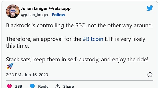 “贝莱德正在控制SEC,而不是相反。因此,这次#Bitcoin ETF很有可能获得批准。堆叠卫星,让它们自我保管,享受旅程!