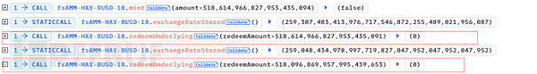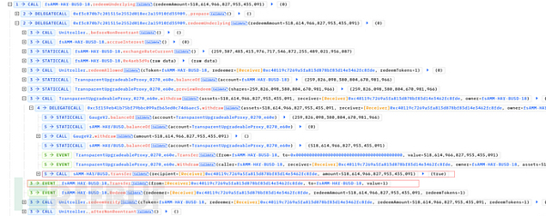 (3)然后又调用了被攻击合约(0xF8527Dc5)的redeemUnderlying函数,又提取518096869957995439653个sAMM代币,由于攻击合约(0xc40119c7)账户中还存有1个fsAMM代币,所以能够成功提取。