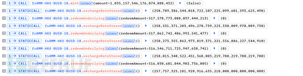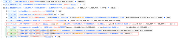 (1)攻击者(0x4b92cc34)调用攻击合约(0xc40119c7)的0x117741f7函数,然后首先调用被攻击合约(0xF8527Dc5)的mint函数将518614966827953435094个sAMM-HAY/BUSD代币转换为2个fsAMM-HAY-BUSD代币,也就是质押币。
