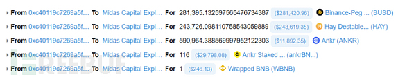 (5)在多次攻击交易后,最后将获得的sAMM代币换成BUSD,HAY,ANKR,WBNB,ankrBNB等获利离场。
