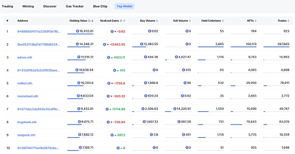 NFTScan 对排名前 1000 的 NFT 持仓价值钱包地址进行了分析,当前持有价值排名前 10 如下图所示: