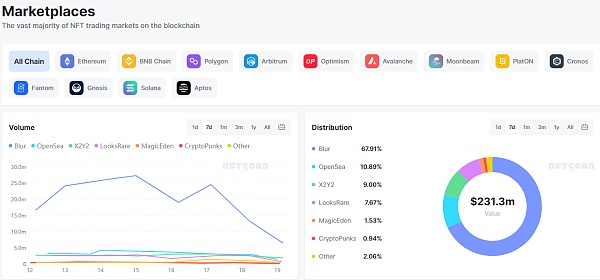 本周:大部分交易市场走势较为平缓,整体交易额在 18 日达到最低,7d 总交易额 $231.3m 较上一周($250.1m)有所下降,Blur 占比 67.91% 占市场约 7 成 。排名前六的交易市场及占比分布: