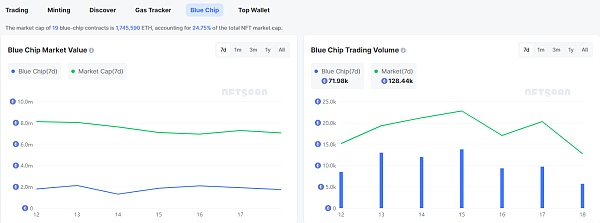 当前 19 只蓝筹合约总市值为 1,745,590 ETH,占 NFT 总市值的 24.75%。