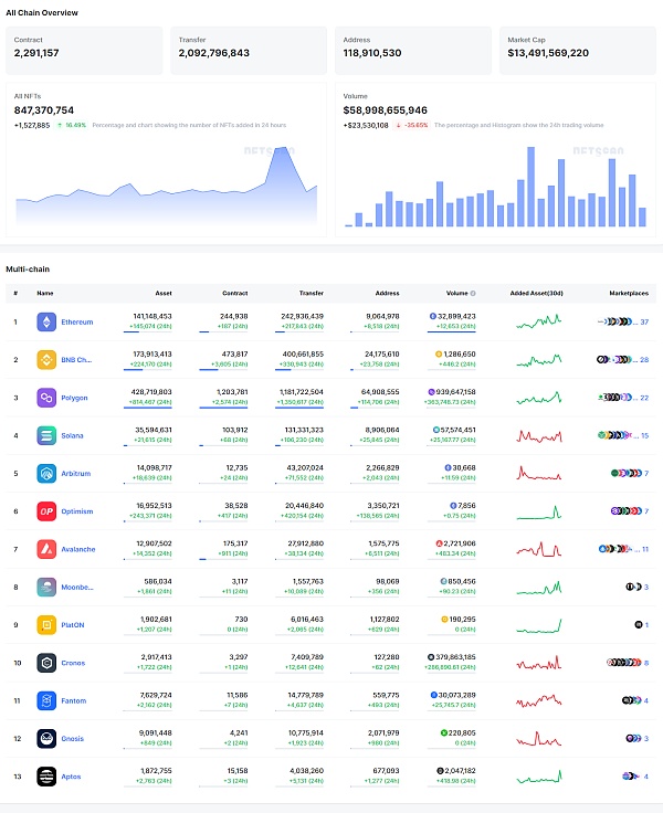 截至 2023 年 6 月 19 日,NFTScan 目前已支持 Bitcoin、Ethereum、BNBChain、Polygon、Solana、Avalanche、Arbitrum、Optimism、Aptos、Fantom、Moonbeam、PlatON、Cronos、Gnosis 14 条主流区块链网络共产生: