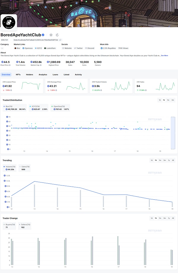 本周热门 NFT 为 BoredApeYachtClub 重回 Ranking 榜首,仍是整体市场的最大变量。7 天内交易分布主要为 Blur(96.14%)、X2Y2(2.19%)、Opensea(1.67%),过去 7 天交易额为 44.35k ETH,交易笔数 986 次。6 月 18 日黄立成的地址通过 Blur 出售了 11 枚 BAYC 系列 NFT,共计获得约 476.43 枚 ETH。