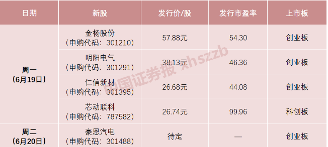 本周(6月19日—6月21日),沪深两市将有5只新股申购,包括1只科创板,4只创业板。从申购日看,大部分集中在周一,周二仅1只,其他3天均无新股申购。