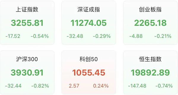 截至收盘,沪指跌0.54%,报收3255.81点;深成指跌0.29%,报收11274.05点;创业板指跌0.21%,报收2265.18点;沪深300跌0.82%,报收3930.91点。