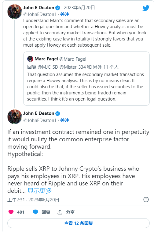 “如果你在每笔交易时都不使用 Howey,而 XRP 本身就是一种证券 b/c Ripple,卖给了一个名叫 Johnny Crypto 的人,那么实际上,Johnny Crypto,他的员工,员工的朋友 Jeremy Hogan, Uphold 和 TapJets 都在一个带有 Ripple 的共同企业中,”Deaton 解释道。