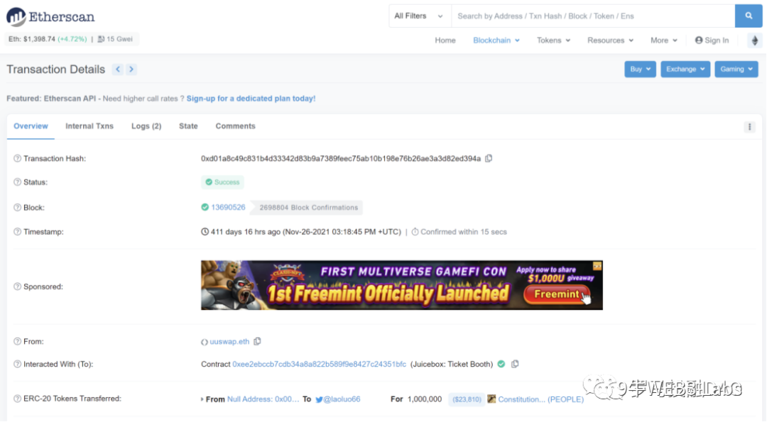 2021年11月11日,ConstitutionDAO吸引了17437名贡献者,并筹集了超过4700万美元。在捐赠截止时间前,1个ETH可以兑换100万个PEOPLE。罗马DAO此时刚成立布局,觉得项目热度高,所以立即参与,收获截图如下。