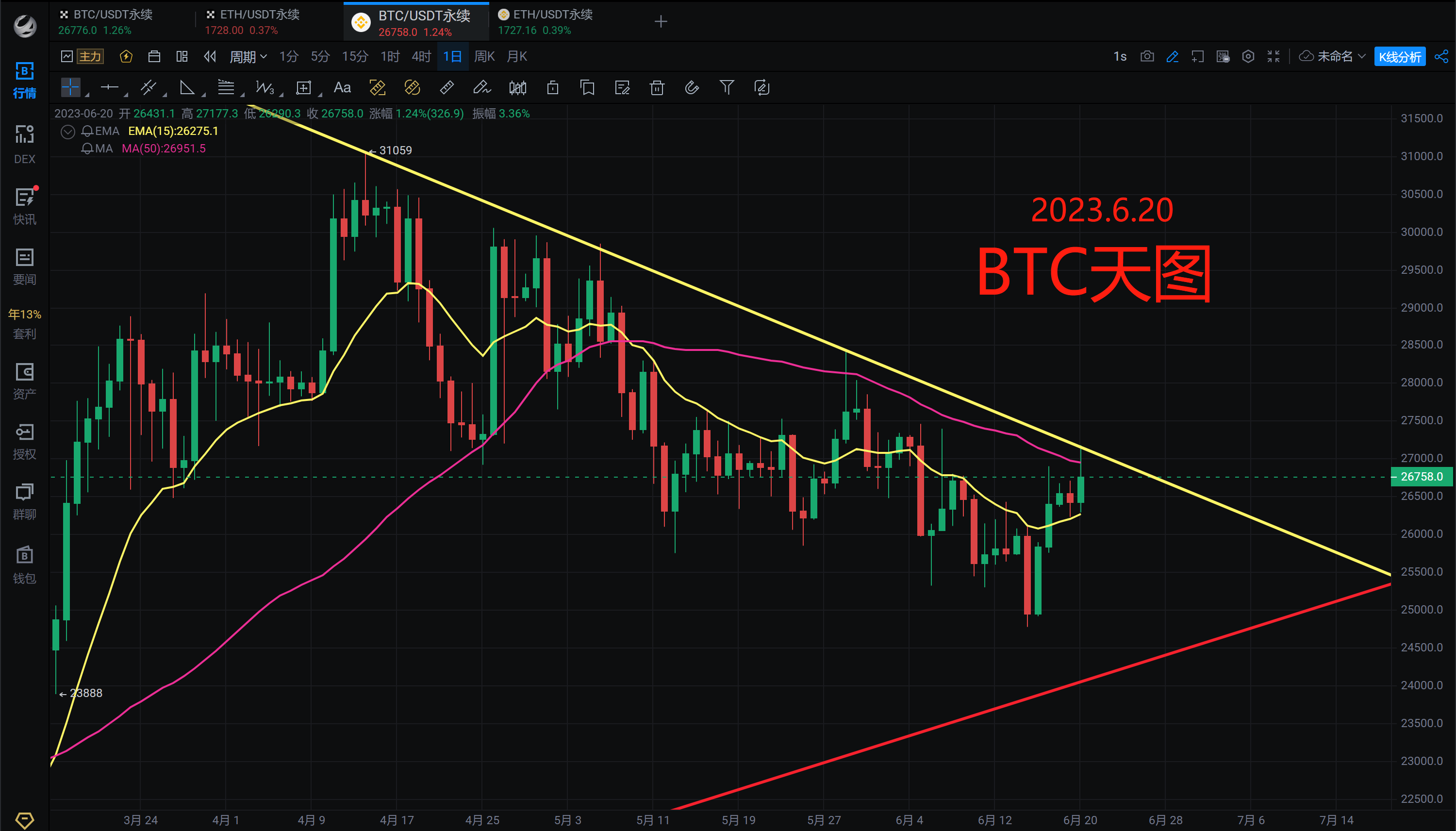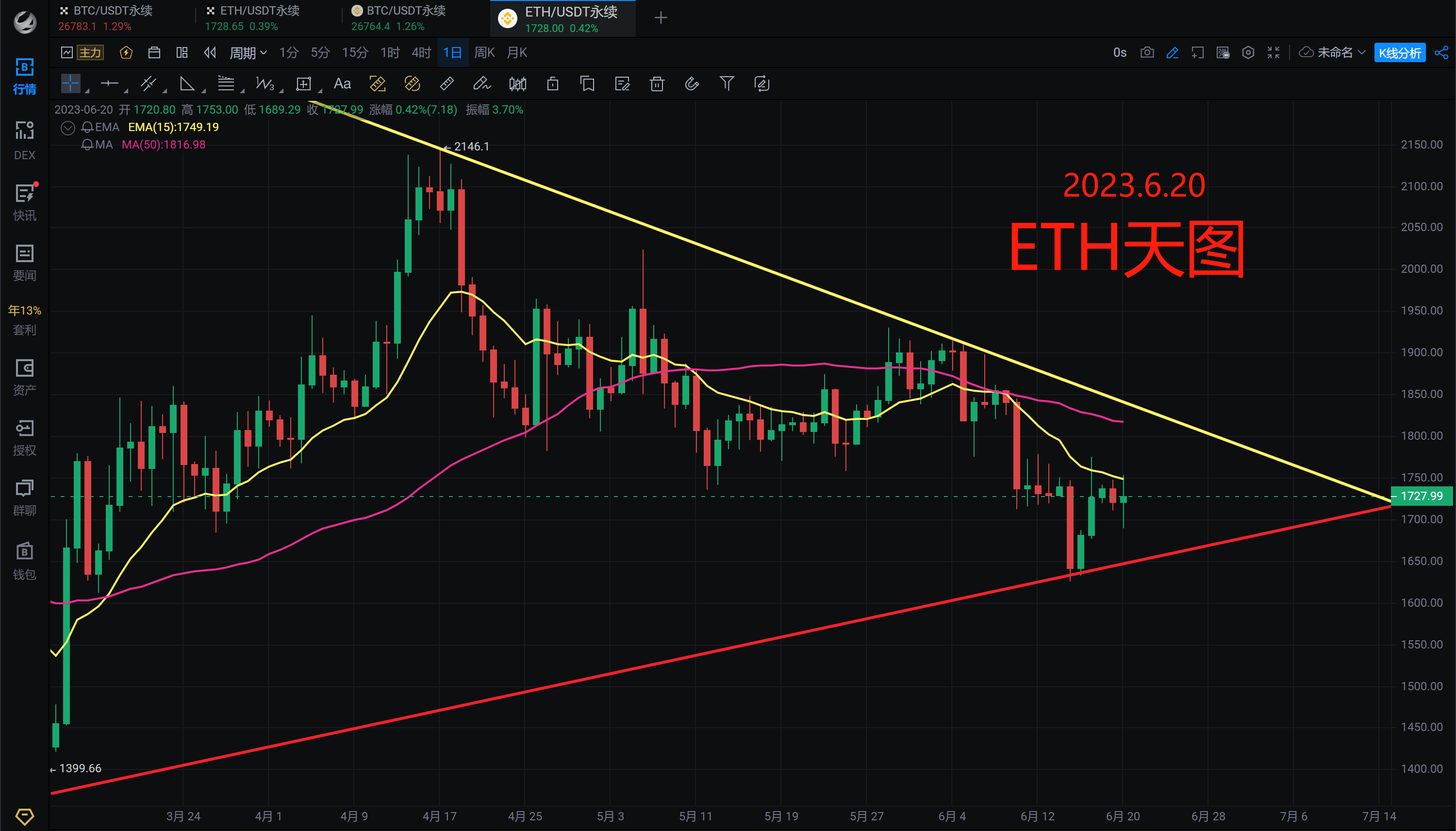 今天有伙伴私信笔者,说ETH的天图符合我们交易系统八大开仓信号的第一次或者第二次反弹均线,适合开空,笔者给他的回复是不能开空,为啥呢?因为现在横盘很久了,格局空间不适合开空,逢低做多比较安全,所以我们要灵活使用,不能所有的行情都往上套。