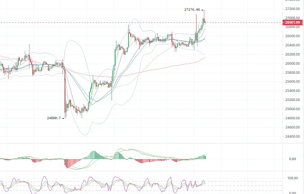 凌晨大饼突破27000,之后又下跌到26400下方,插针走势之后在两个小时内又站稳26800,现在依然处于26800上方活动,日线也是一根小红柱收盘。目前行情还是震荡上行,四小时阳包阴,布林带开口向上,kdj形成金叉向上,MACD多头能量柱放量运行,趋势上还是反弹,小时线来看布林带开口向上,价格现在在上轨上方运行,现在这个位置上下都有空间 建议观望先。上方关注27500压制 下方关注26200短线支撑,操作上参考27500-26000区间来高抛低吸即可。