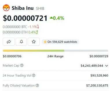 截至发稿时,柴犬的交易价格为 0.00000722 美元,在 24 小时日内交易中上涨 0.5%。SHIB 也较 2021 年 10 月创下的历史高点 0.00008616 美元下跌了 91.64%。