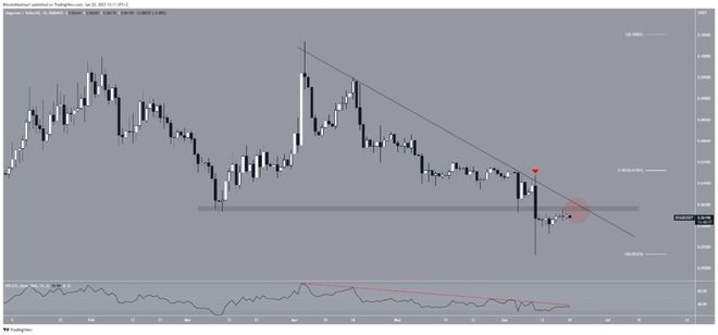 除了下降阻力线,RSI 还遵循下降趋势线(红线)。因此,在价格突破之前,趋势被认为是看跌的。如果再次遭到拒绝,DOGE 价格可能会跌至 0.050 美元。
