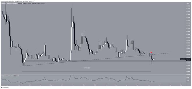 这种长期结构的崩溃表明之前的趋势已经结束,新的趋势已经开始朝相反的方向发展。就 DOGE 而言,这意味着价格可能已经开始新的长期下行趋势。
