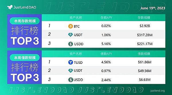 JustLend DAO借贷市场存借规模TOP3一览(截至2023年6月19日)