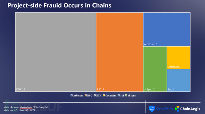 项目方诈骗主要集中于ETH链,部分发生在BSC链上,少数事件发生在Arbitrum和其他平台上。