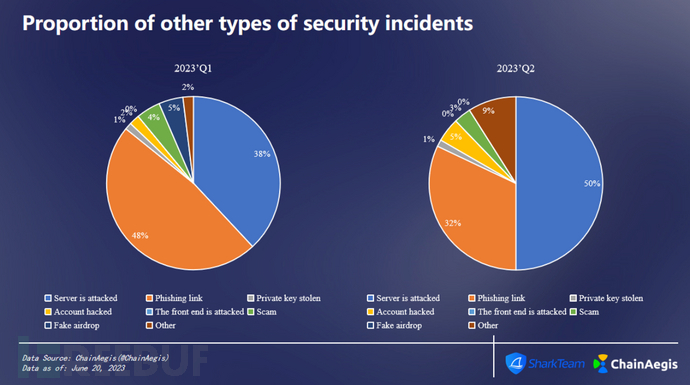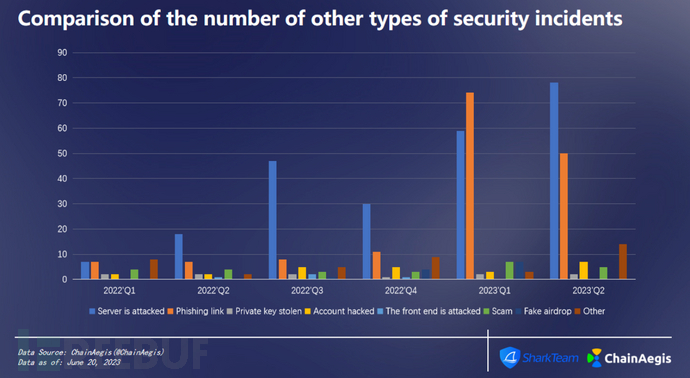 2023年第二季度其他类型的安全事件共发生了156起,其中服务器遭攻击发生78起,占比最大达50%,较上一季度增长了12%。其次为钓鱼攻击,累积发生50起,占比32%,较上一季度减少了16%。其他事件较上月略有增长,如热钱包被盗、NFT被盗、版税漏洞、交易应用程序被破坏等等。黑客诈骗手段不断更新,涉及领域愈发广泛,在进行项目投资时,仍要小心提防,避免因小失大。