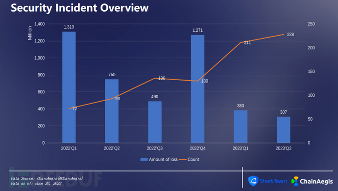 根据SharkTeam链上安全分析平台ChainAegis数据,2023年第二季度Web3领域共发生了超过228起安全事件,损失金额累计超过3.07亿美元。在新的季度中,Web3安全事件依旧呈现高发态势,较上一季度(211起)上涨约8.05%,但损失资金较上一季度(3.83亿美元)下降了19.79%。