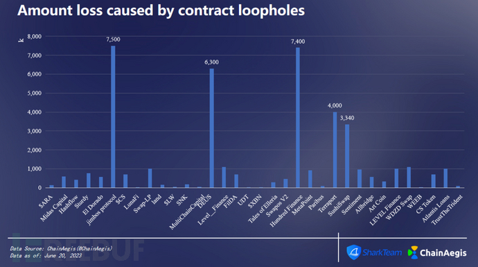 2023年第二季度因合约漏洞造成的安全事件共41起,累计造成超过7,419.69万美元的资金损失。