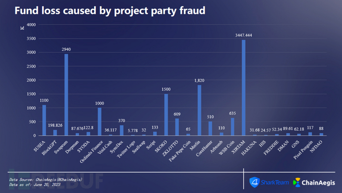 2023年第二季度Rug pull事件共有31起,累计造成超过1,518.83万美元的资金损失。建构在Arbitrum生态上的项目XIRTAM,是一个无需KYC的声誉建立平台,主张透过XIRTAM系统以匿名和去中心化方式一步步建立数字声誉,同时用户参与XIRTAM上的活动可获得奖励。该项目方在5月3号Rug Pull,部署者窃取了约1,909ETH的用户资金,是本季度损失最严重的一起Rug pull事件。此外,本季度Swaprum、Merlin及$KOKO损失金额均超过150万美元。