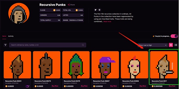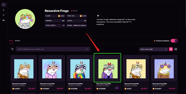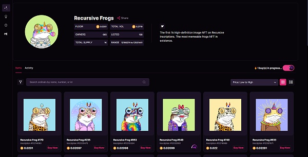 递归铭文是由比特币协议Ordinals创建者Casey Rodarmor提出来的,单独为一个集合铭刻10000个JPEG文件非常昂贵,但是集合中铭刻200个特征,然后再进行对合集的铭刻,每个都使用少量代码来请求特征并以编程方式呈现图像,这种方式会大大的解决空间一级Gas成本,使得艺术品以一种更有效的方式存储在链上。它的第一个项目Recursive Punks前两天最高价接近0.002BTC,接近三十倍的涨幅也让这个协议迅速被关注起来,也陆陆续续出现很多其他项目如Recursive Frogs等。