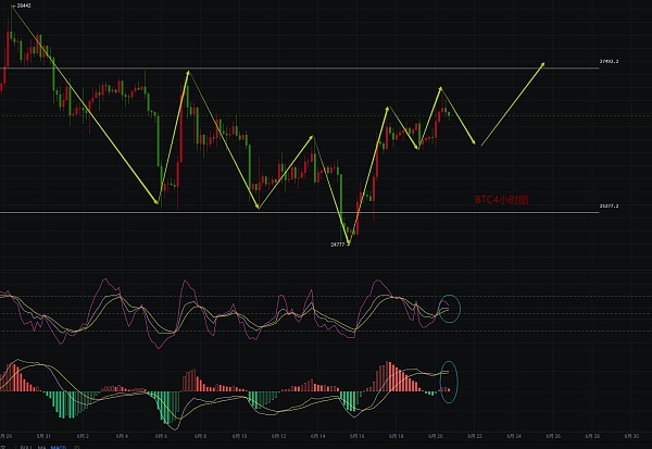 短线4小时在日你连续向上插针,K线走出塔型顶形态,当前BOLL略微开口向上,KDJ指标三线拐头向下,MACD指标红色实体动能柱缩量,从短线目前走势来看,短线高点邻近27500一线前压,短线行情有回踩迹象,日线行情6月19日K线呈实体阳K,6月20日K线目前呈上插针阴K,K线呈倒垂形态,KDJ指标三线向上运行,K线和J线已运行至80轴上方,MACD指标红色空心动能柱放量,从日线来看行情目前出现承压回落趋势,上方压力位未能一次突破,行情大概率会 回踩中轨一线后再反弹,不过目前行情还是处于多头趋势,建议以回踩支撑位多为主