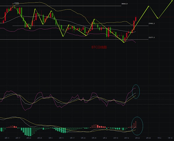 BTC行情在日内凌晨急速上涨,行情上涨幅度近3000点,最高点突破29000整数关口,短线4小时行情延BOLL上轨上涨,目前行情运行在BOLL上轨上方,KDJ指标三线运行至80轴上方略微拐头,MACD指标红色空心动能柱放量,短线来看,目前行情将进入上涨后震荡修复阶段,日线6月20日K线呈实体阳K,K线突破BOLL上轨,6月21日K线目前呈光脚阳K,K线目前运行在BOLL上轨上方,当前BOLL呈开口,KDJ指标三线向上运行,MACD指标红色空心动能柱放量,综合来看:目前行情处于多头放量阶段,行情还有继续上涨的趋势,建议还是以多为主